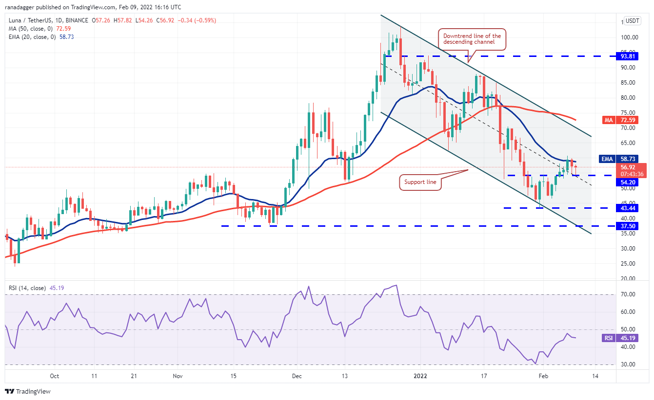 The relief rally in Terra’s LUNA token hit a wall at the 20-day EMA ($58). This suggests that the sentiment remains negative and bears are selling on rallies to strong resistance levels.