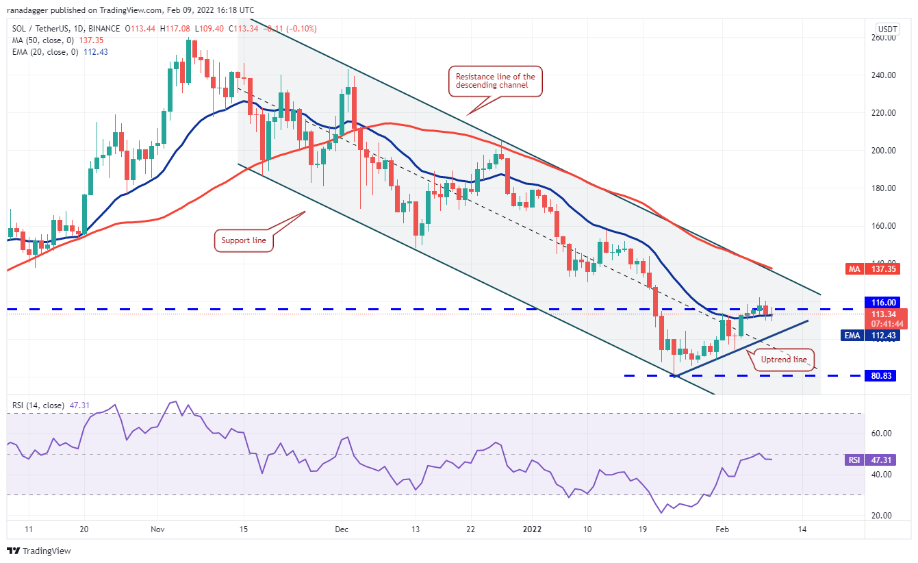 The buyers have not yet given up as they are trying to defend the 20-day EMA ($112). If the price rebounds off the current level, the bulls will attempt to push the SOL/USDT pair above $121.93. If they manage to do that, the pair could rally to the resistance line.