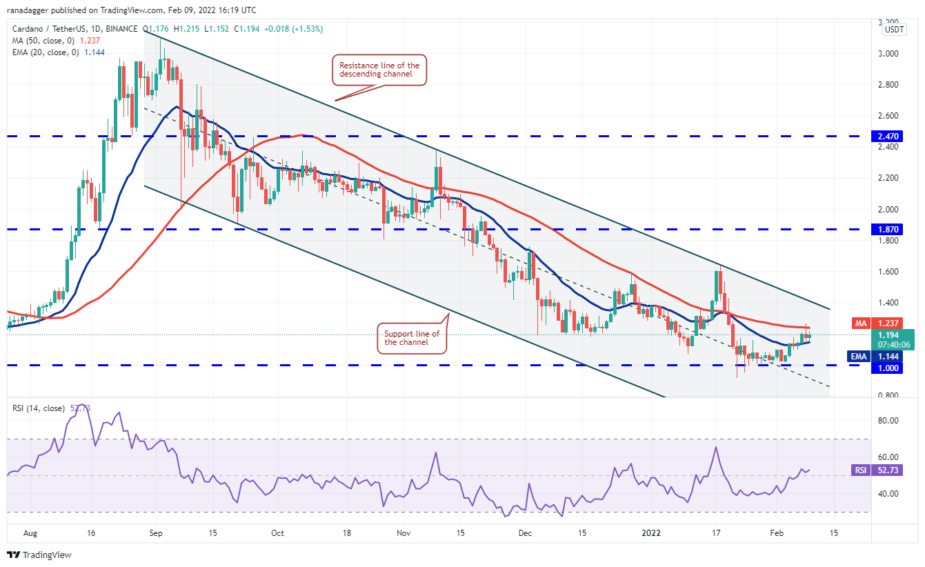 The bulls tried to propel Cardano (ADA) above the 50-day SMA ($1.23) on Feb. 8 but the bears held their ground. This pulled the price back to the 20-day EMA ($1.14). The price is now stuck between the moving averages.