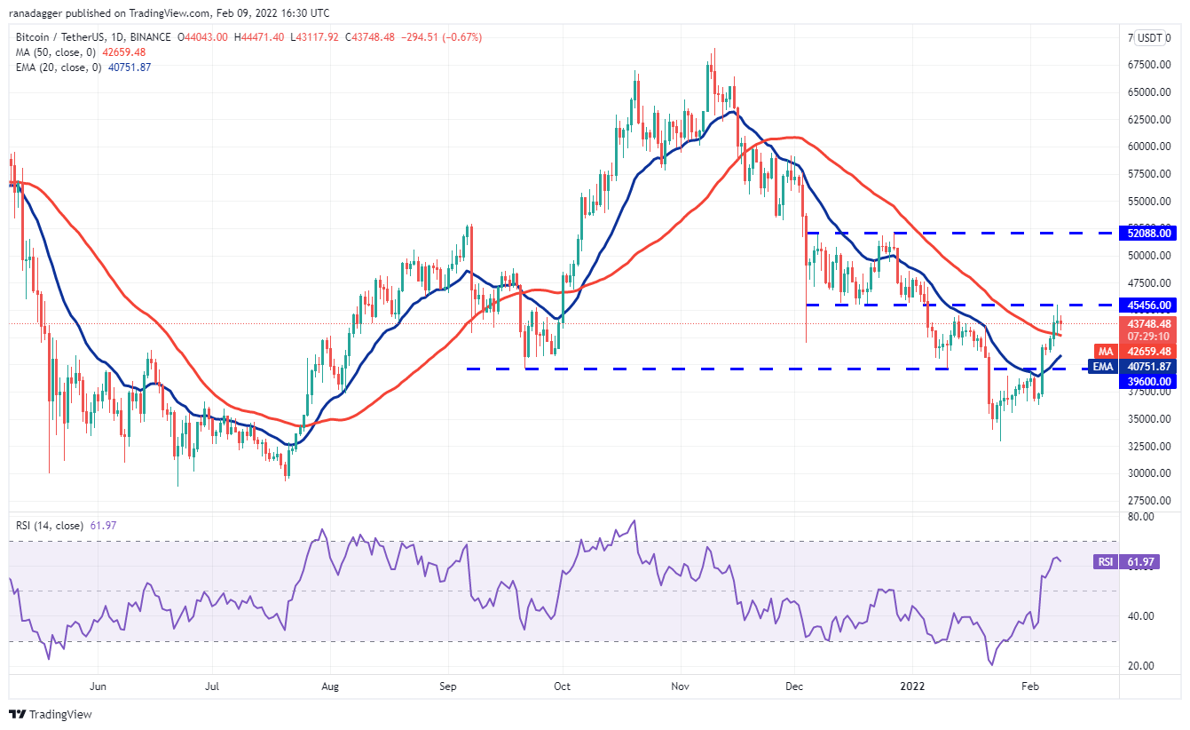 Bitcoin broke above the 50-day simple moving average ($42,659) on Feb. 7 and reached the overhead resistance at $45,456 on Feb. 8. This level proved to be a strong resistance and the price turned down from it.