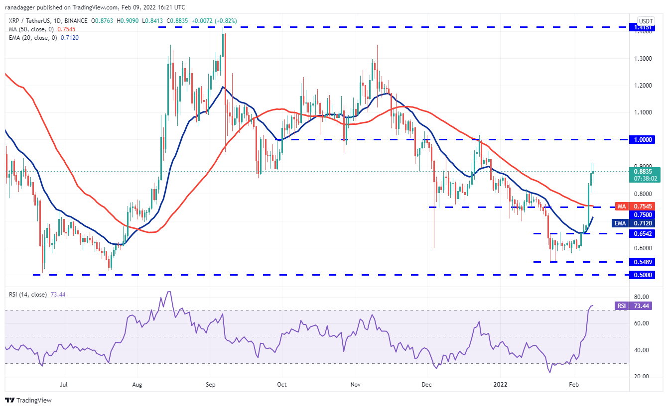 Ripple (XRP) surged and closed above the 50-day SMA ($0.75) on Feb. 7 which is the first indication that the downtrend could be over. Traders are booking profits near $0.91 which could result in a minor correction or consolidation.