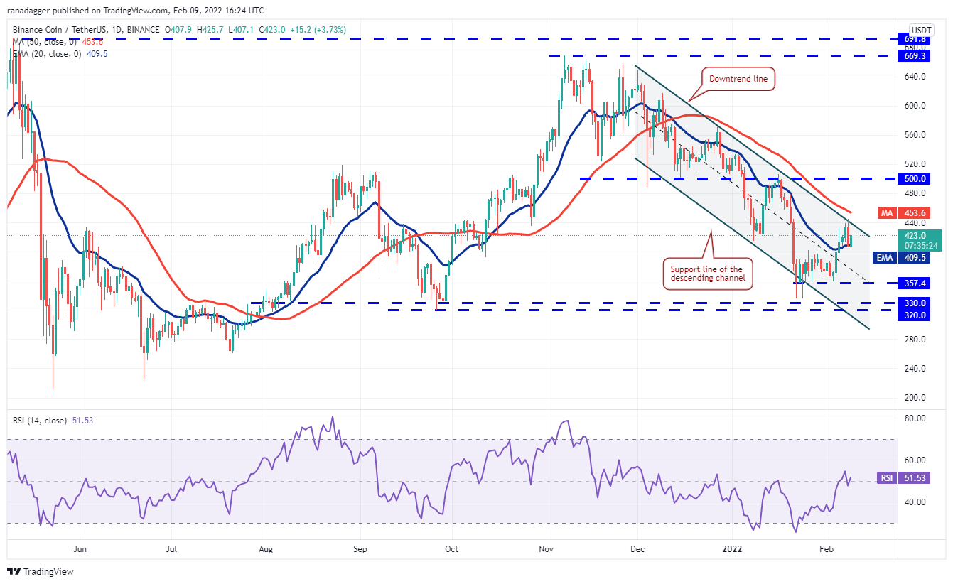 Binance Coin (BNB) turned down from the downtrend line on Feb. 18, indicating strong resistance from the bears. The price has dropped to the 20-day EMA ($409), which is an important support to keep an eye on.