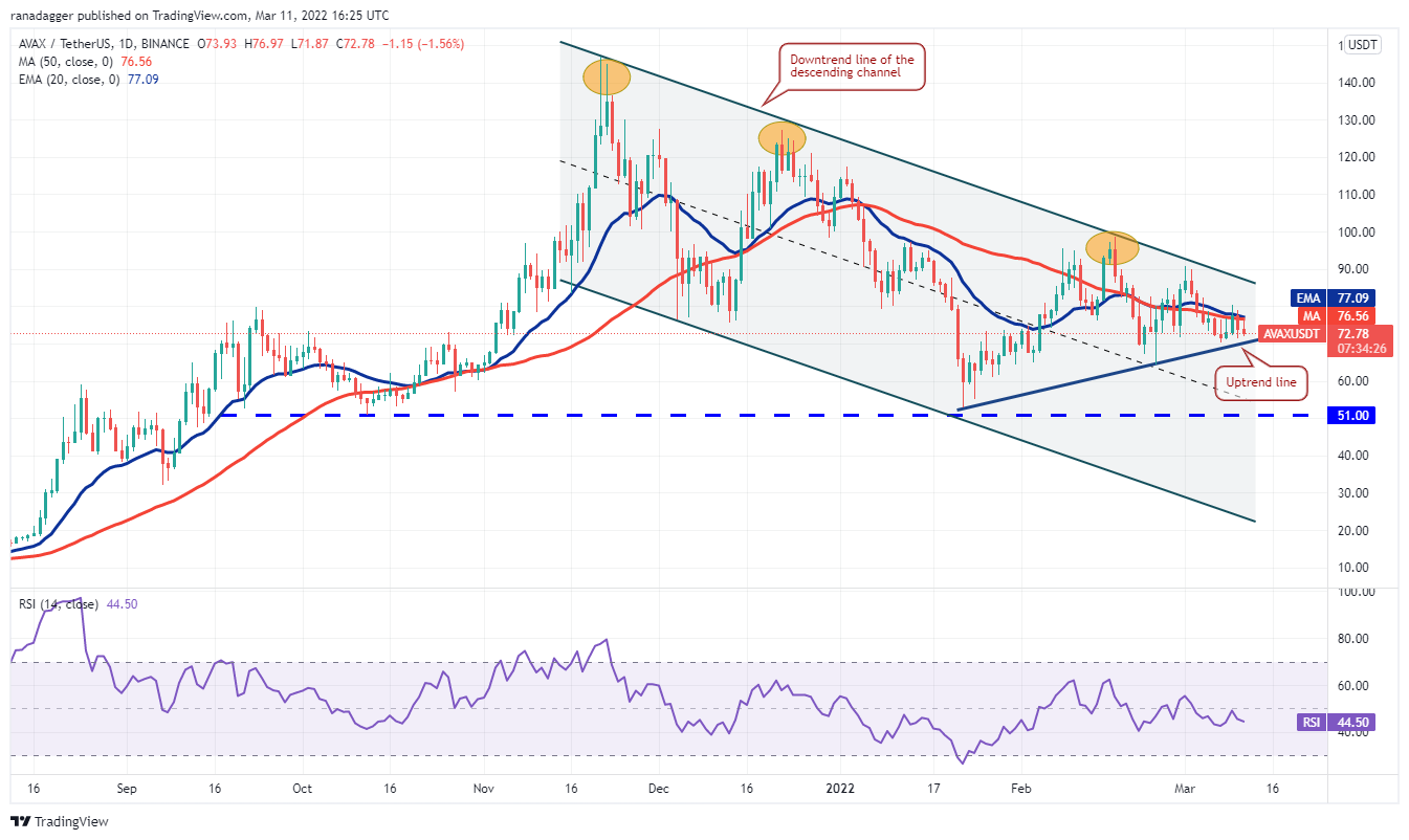 Avalanche (AVAX) failed to climb and sustain above the moving averages on March 9. This suggests that bears are defending the moving averages while the bulls are buying on dips to the uptrend line.