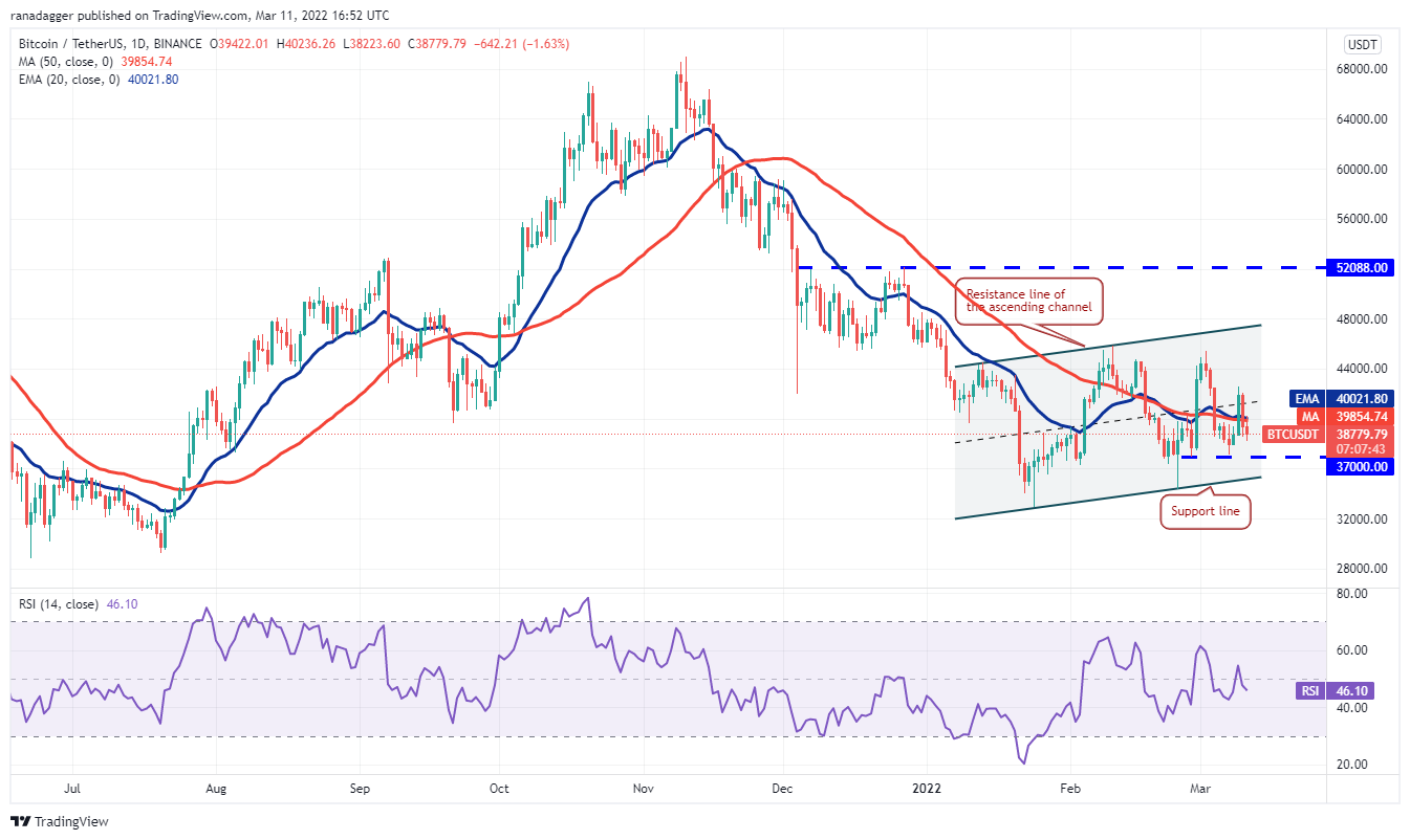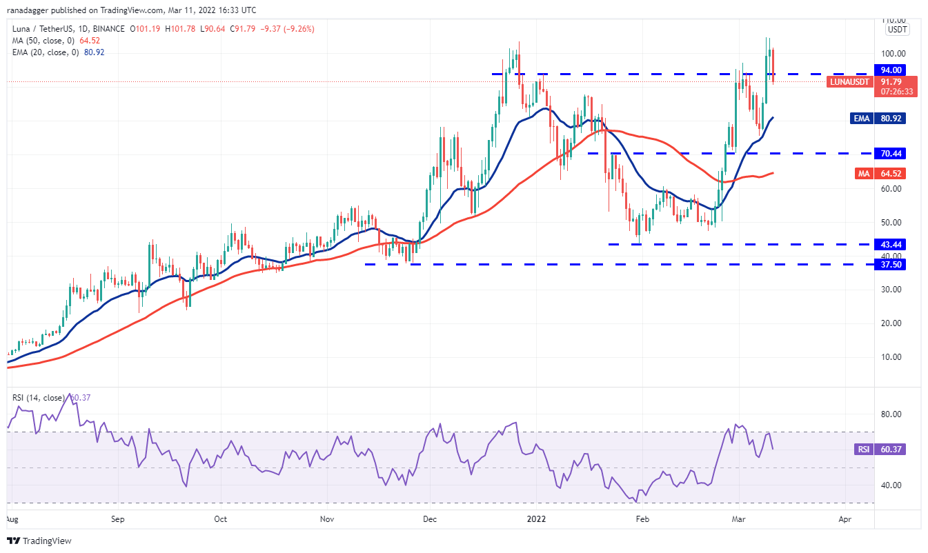 Terra’s LUNA token rose to a new all-time high on March 9 but the long wick on the day’s candlestick shows profit-booking at higher levels. The bulls again tried to resume the uptrend on March 10 but the bears had other plans.