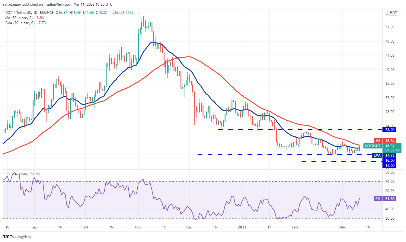 After struggling to stay above the 20-day EMA ($17) on March 9 and 10, Polkadot (DOT) has managed to break the resistance today. The bulls are currently attempting to push and sustain the price above the 50-day SMA ($18).