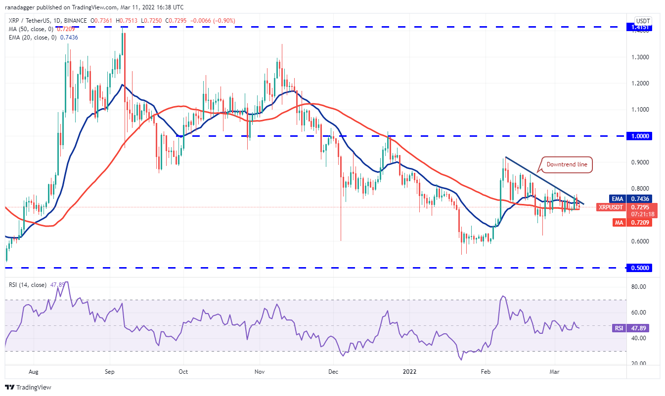 The DOGE/USDT pair dropped back below $0.12 on March 10, increasing the possibility of a retest of the critical support at $0.10. This zone is likely to attract strong buying from the bulls. The buyers will have to push and sustain the price above the 50-day SMA ($0.13) to indicate that the downtrend could be weakening.