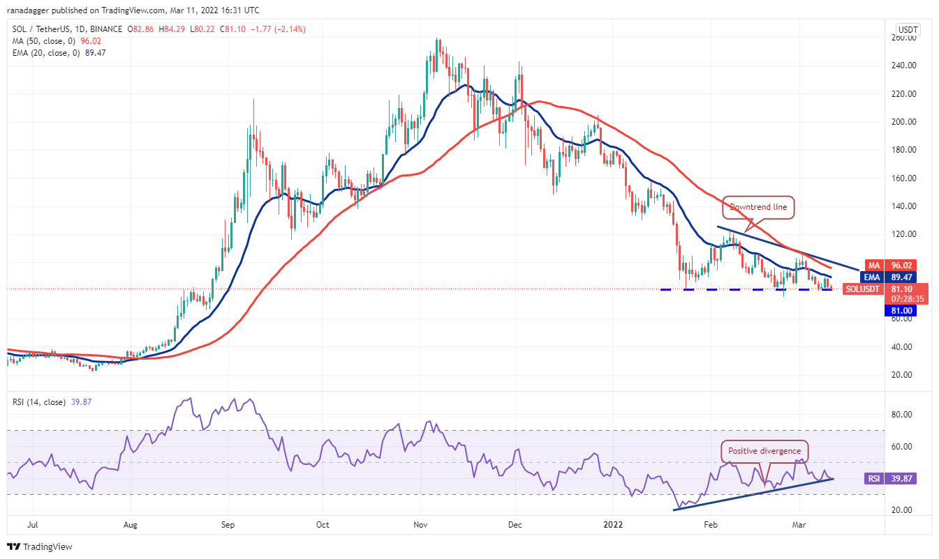 Solana (SOL) has been trading inside a descending triangle pattern, which will complete on a break and close below the crucial support at $81. The bulls tried a recovery on March 9 but could not push the price above the 20-day EMA ($89).