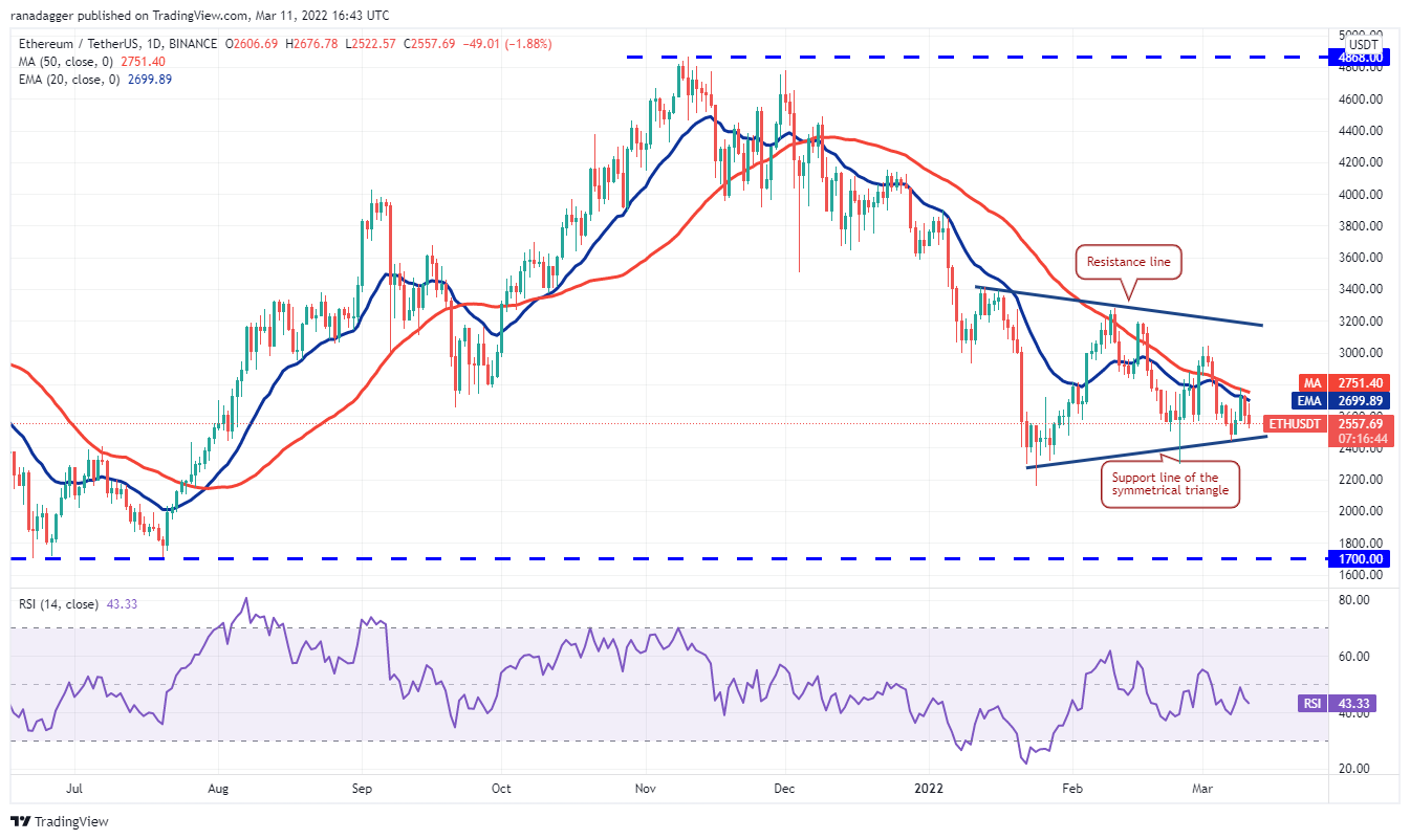 Ether’s (ETH) rebound met with stiff resistance at the 50-day simple moving average ($2,751) on March 9, indicating that bears are not willing to let go of their advantage easily. The price turned down from the moving averages on March 10 but a minor positive is that the bulls are attempting to defend the support line of the symmetrical triangle.