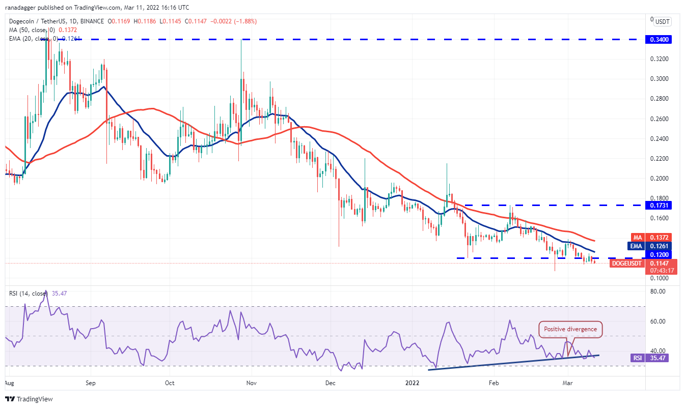 Dogecoin’s (DOGE) relief rally on March 9 fizzled out at the 20-day EMA ($0.12). This suggests that the bears are not ready to give up and they continue to sell near resistance levels.