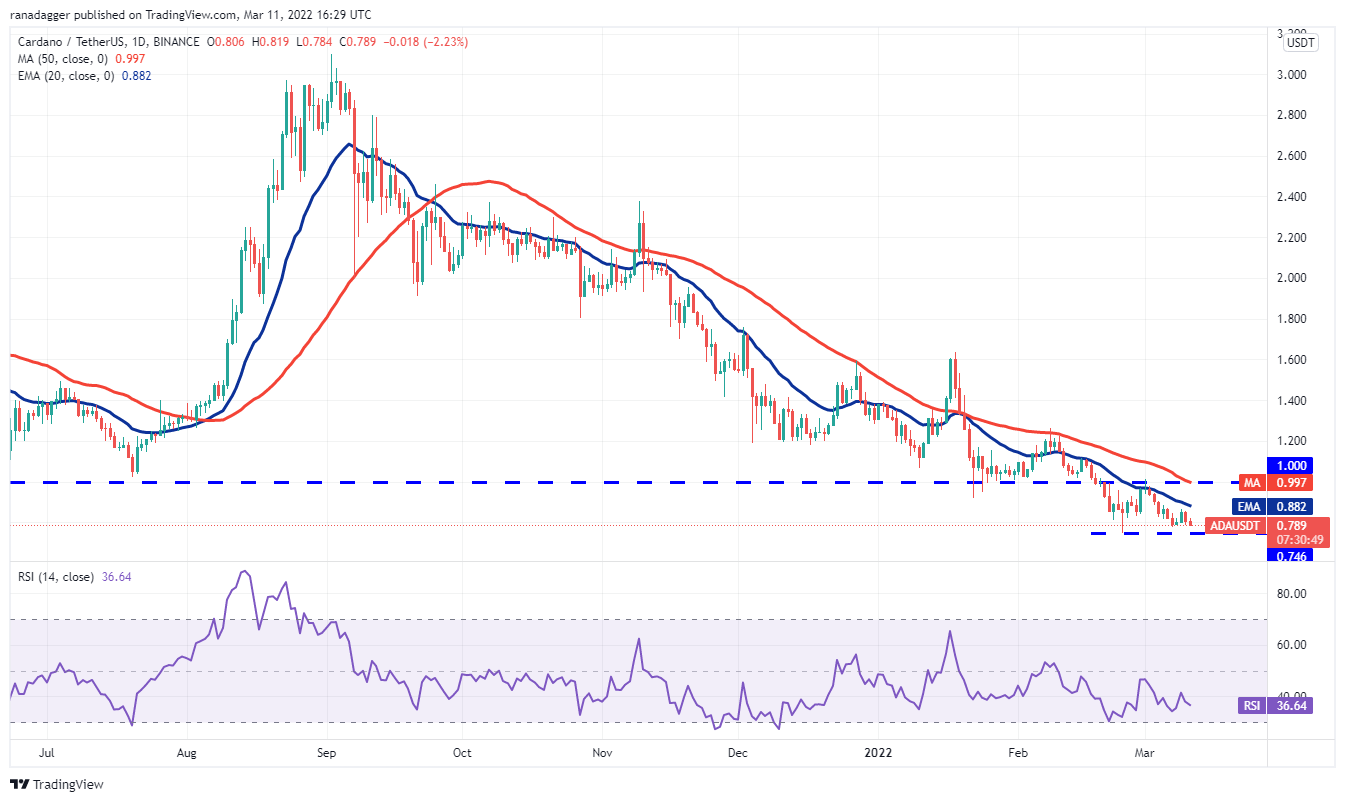 Cardano’s (ADA) attempt to recover on March 9 met with strong resistance at the 20-day EMA ($0.88). This suggests that the sentiment remains negative and traders are selling on every minor rally.