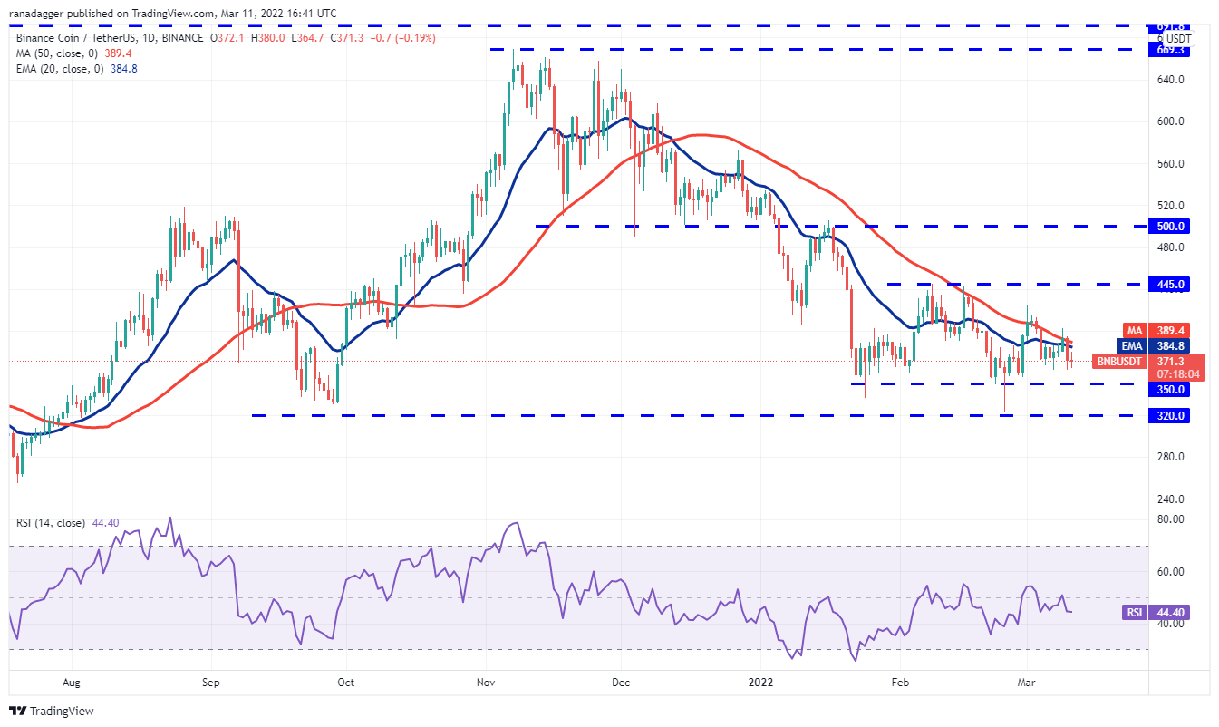 Binance Coin (BNB) rose above the 50-day SMA ($389) on March 9 but the bulls could not sustain the higher levels. The bears took advantage of this situation and pulled the price back below the moving averages on March 10.