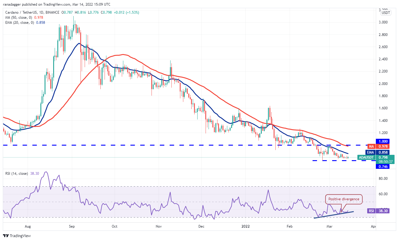 The bulls will have to push and sustain the ADA/USDT pair above the 20-day EMA ($0.85) to signal that the bears may be losing their grip. That could open the doors for a possible retest of the breakdown level at $1. This level is likely to attract strong selling.