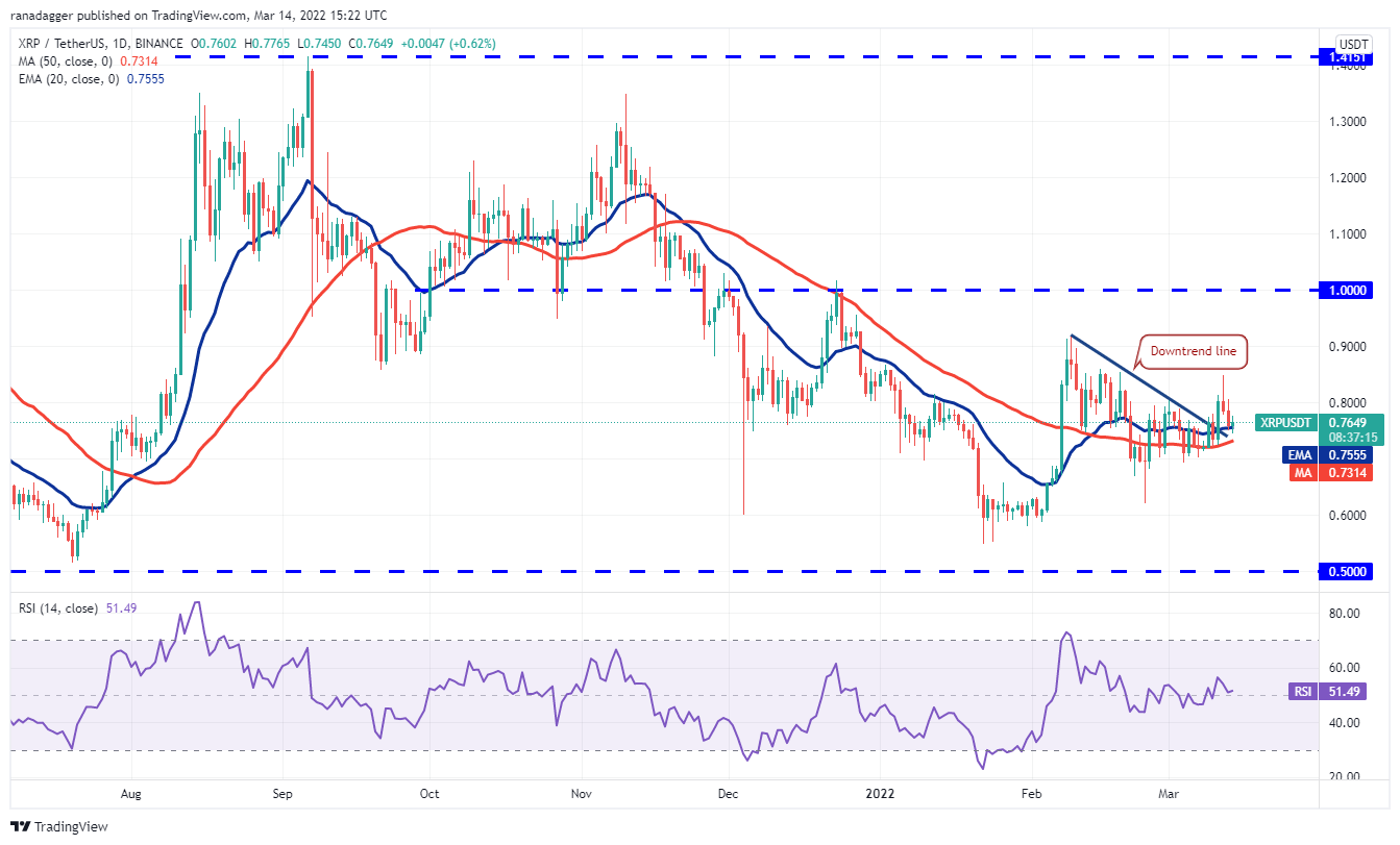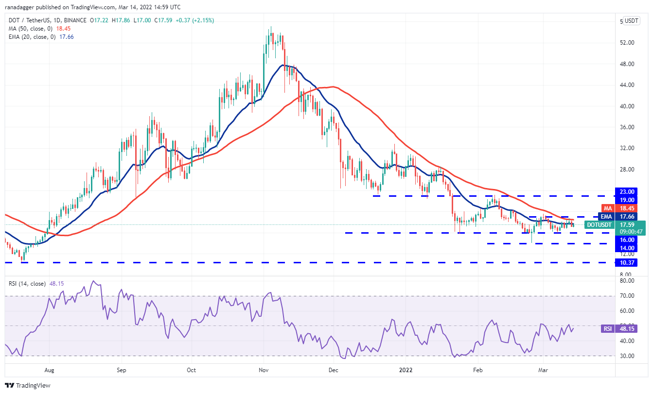 Polkadot (DOT) once again turned down from the 50-day SMA ($18) on March 13 but the bulls are not allowing the price to sustain below the 20-day EMA ($17).