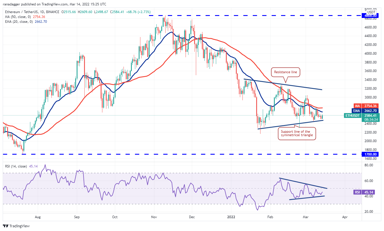 The bulls are attempting to defend the support line of the symmetrical triangle. A strong bounce off the current level could push Ether (ETH) to the moving averages where the bears are again likely to mount a strong defense.