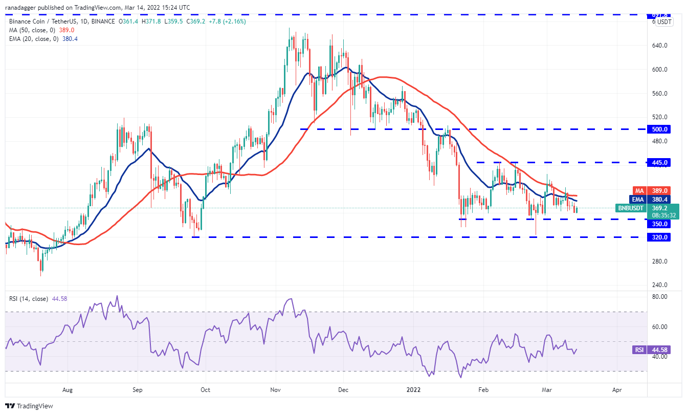 The buyers will have to push and sustain the price above the moving averages to indicate that the bears may be losing their grip. If the price sustains above the 50-day simple moving average ($389), the bulls will attempt to push the BNB/USDT pair to $425.
