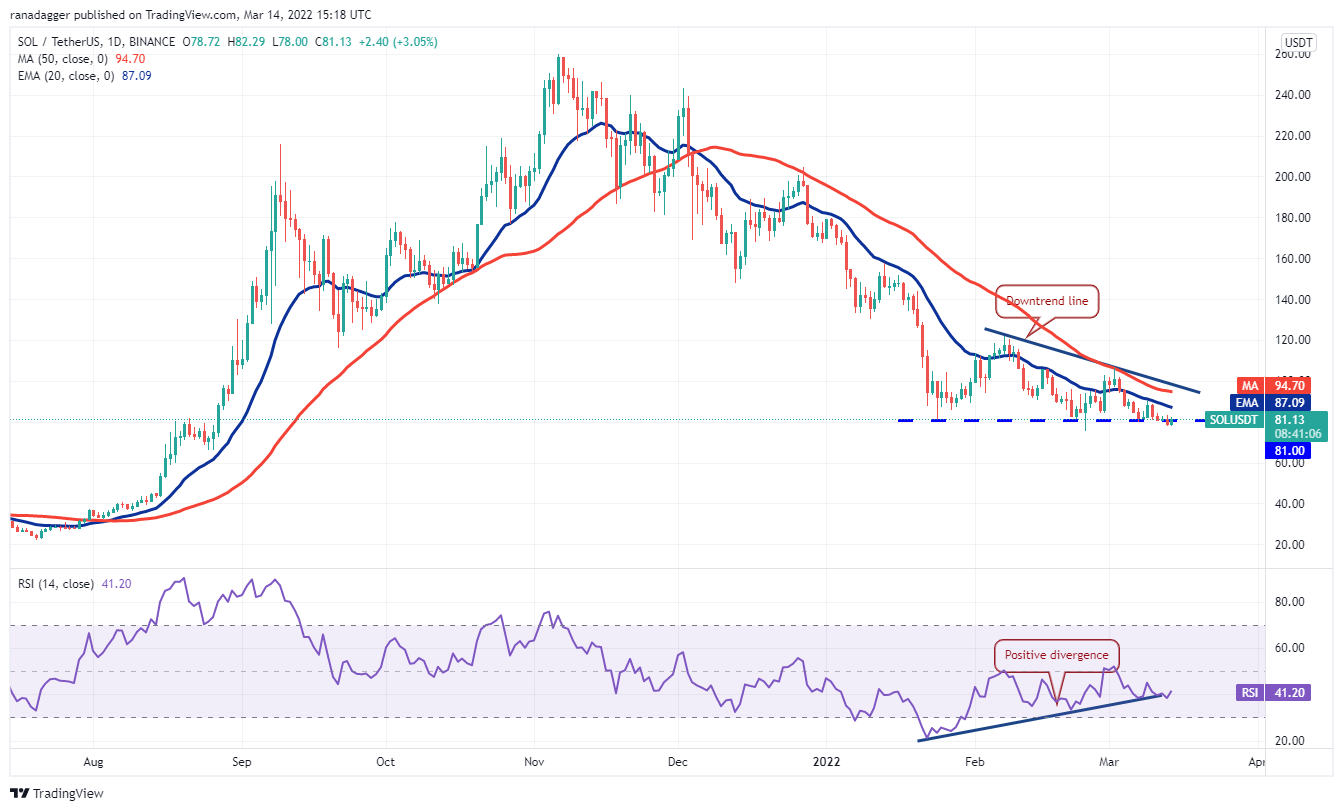 Solana (SOL) broke and closed below the strong support at $81 on March 11 and followed it up with further selling on March 13. However, the bears have not been able to break the intraday low at $75 made on Feb. 24.