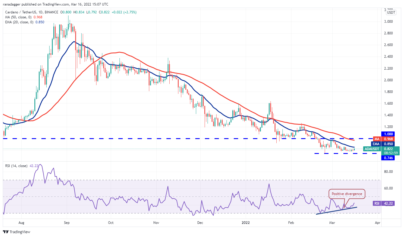 Cardano (ADA) is attempting to rise above the 20-day EMA ($0.85) but the bears are expected to mount a strong defense at the resistance.