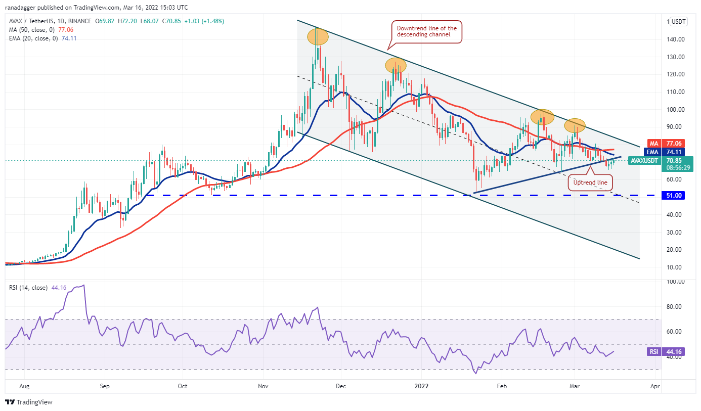 Avalanche (AVAX) has been sustaining below the uptrend line since March 13 but the bears have not been able to capitalize on this weakness and sink the price below the immediate support at $64. This indicates a lack of sellers at lower levels.