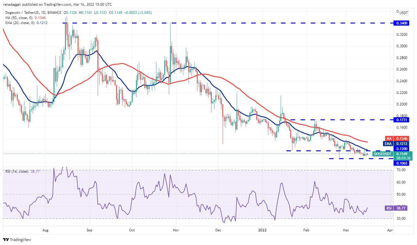 Dogecoin (DOGE) turned down from the 20-day EMA ($0.12) on March 14, indicating that higher levels are witnessing strong selling by the bears.