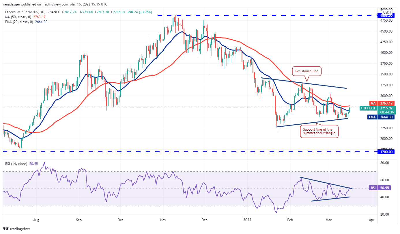 Ether (ETH) bounced off the support line of the symmetrical triangle and the buyers are attempting to push the price above the 50-day SMA ($2,763).