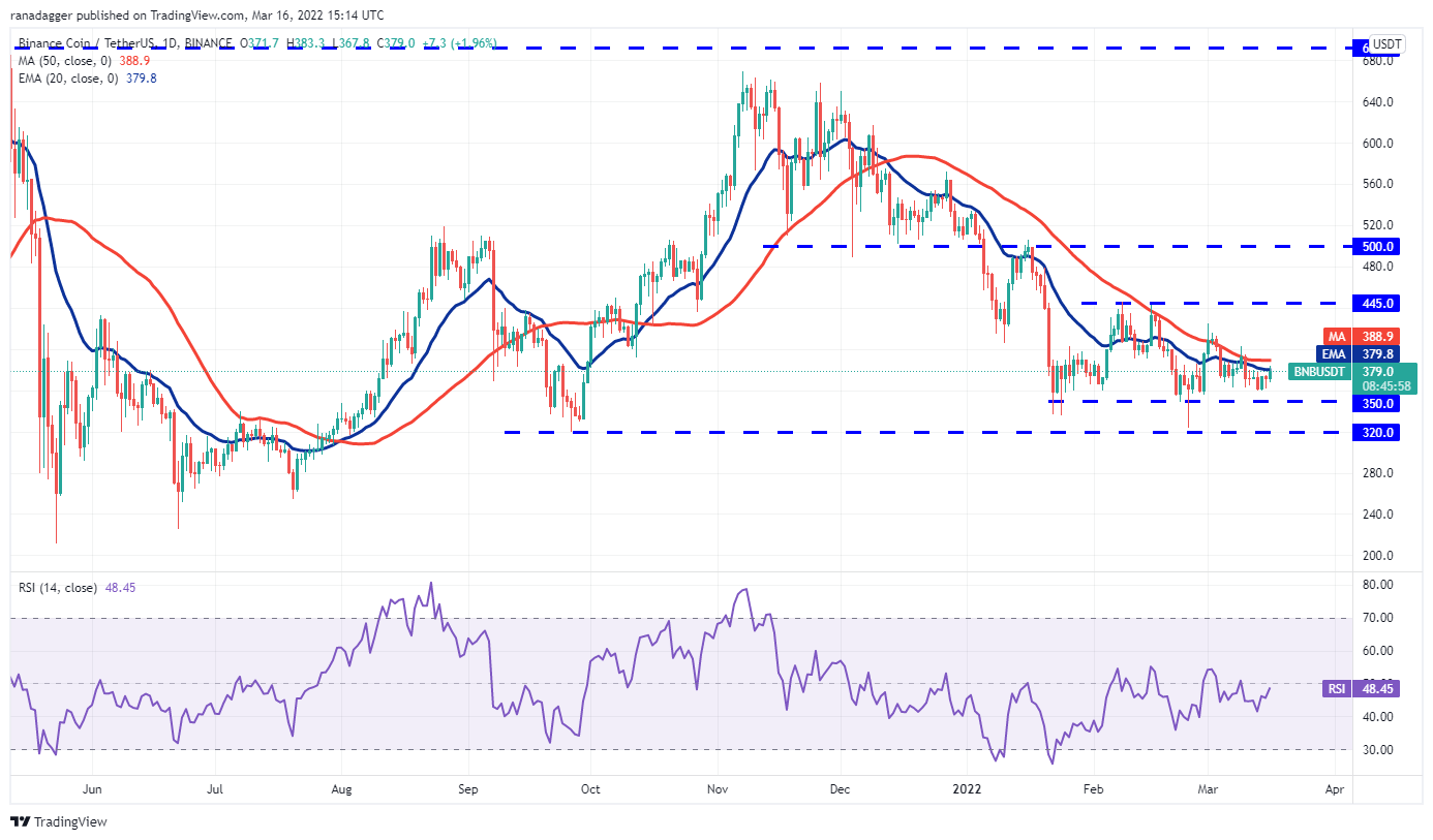Both the moving averages are flattening out and the RSI has risen above 48, indicating that bulls are attempting a comeback. If buyers drive and sustain the price above the 50-day SMA ($388), the BNB/USDT pair could rise to $425 and thereafter to $445.