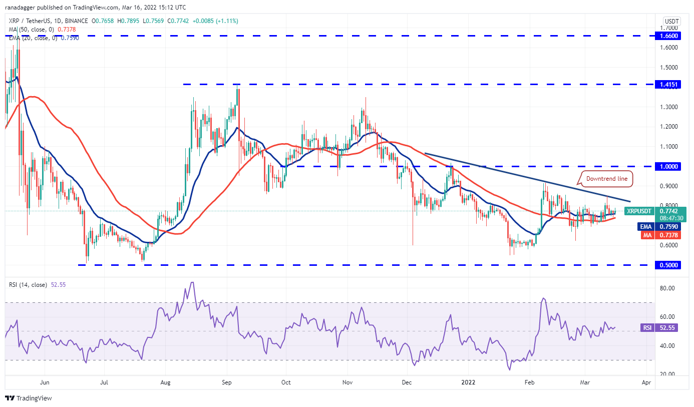 Both moving averages have flattened out and the RSI is near the midpoint, indicating a balance between supply and demand. The buyers will have to push and sustain the price above the downtrend line to gain the upper hand. The XRP/USDT pair could then rally to $0.91 and later to the psychological level at $1.