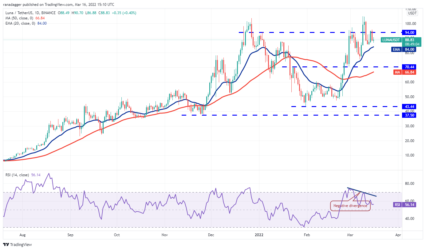 Terra’s LUNA token broke above the overhead resistance at $94 on March 14 but the bulls could not sustain the higher levels. The bears pulled the price back below $94 on March 15.