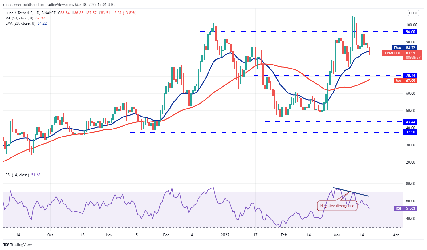 Terra’s LUNA token has broken below the 20-day EMA ($84), suggesting that the failure to sustain the price above $96 may have attracted profit-booking from the short-term traders.