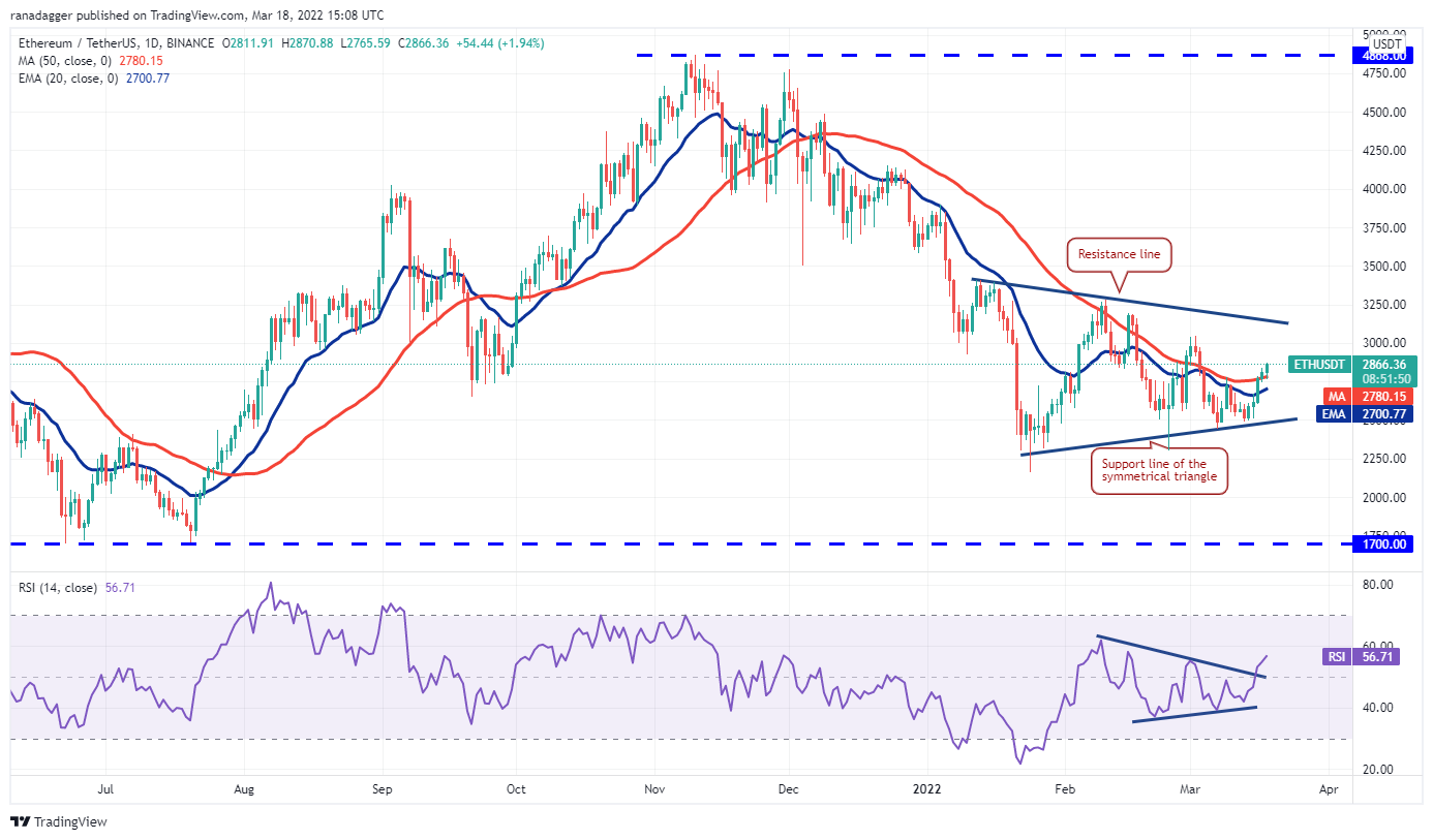 Ether (ETH) broke and closed above the 50-day SMA ($2,780) on March 16, indicating a strong comeback from the bulls. The buyers held the dip to the 50-day SMA today and are attempting to extend the recovery.