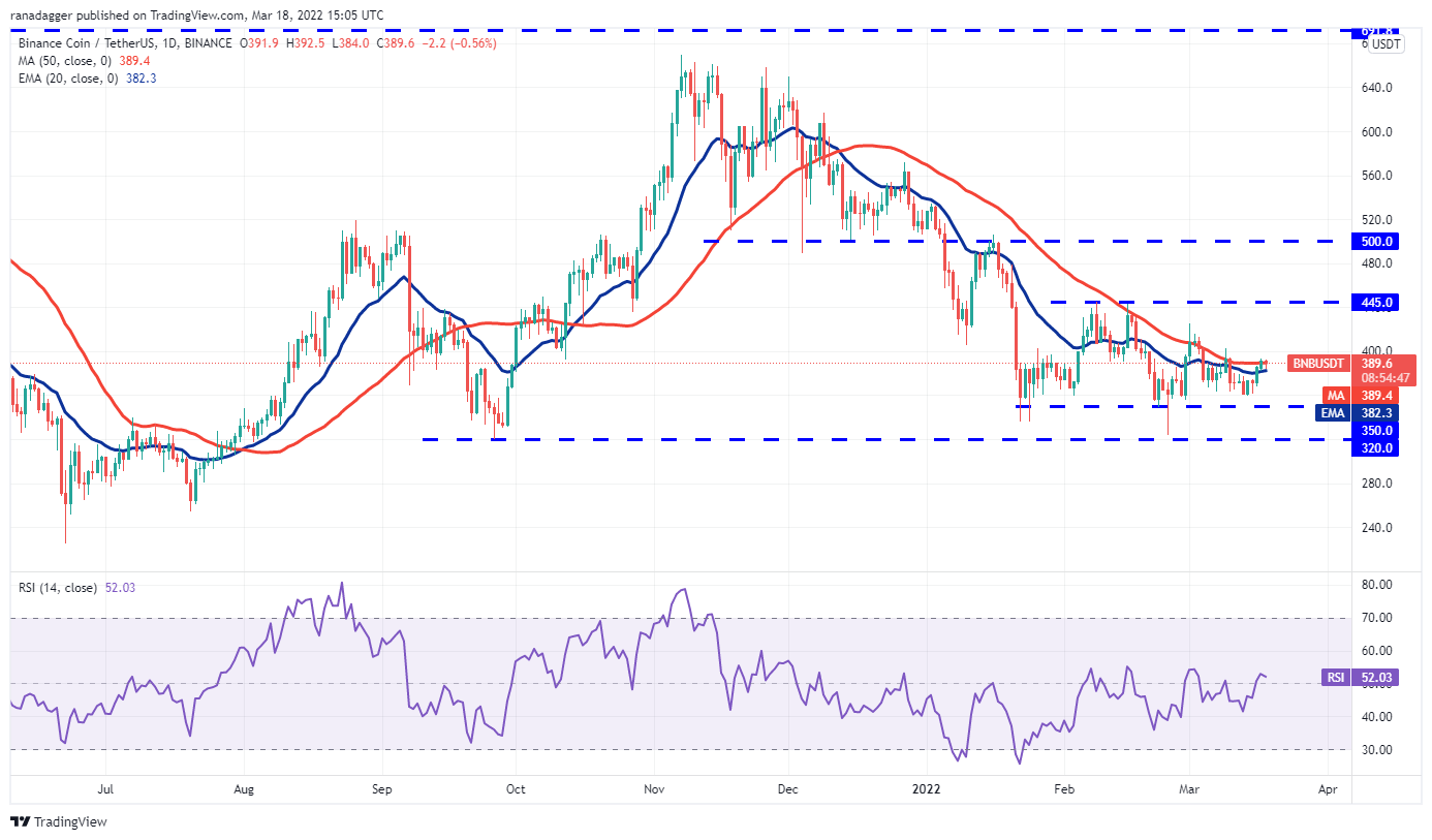 BNB is facing resistance at the 50-day SMA ($389). This is the fourth instance when the bears are posing a strong challenge at this level. Therefore, the 50-day SMA becomes a key level to watch out for on the upside.