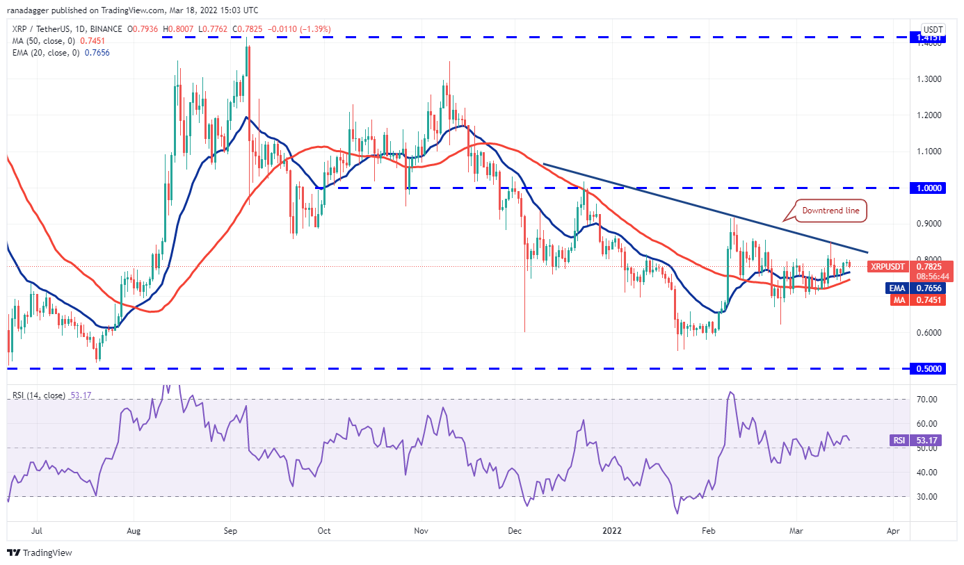 Ripple (XRP) bounced off the 50-day SMA ($0.74) on March 15 but the bulls have not been able to challenge the downtrend line. This suggests that the bears are selling on rallies.