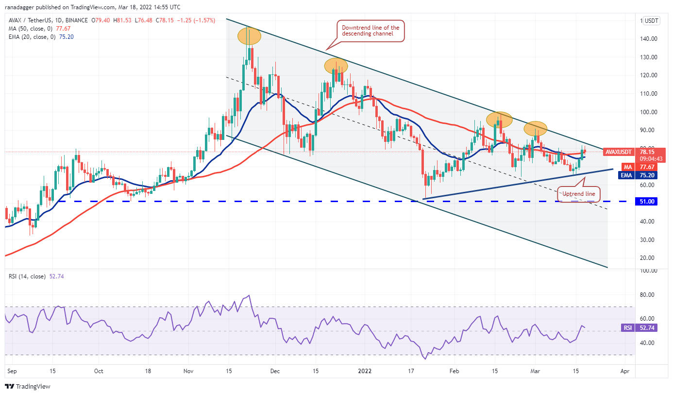 Avalanche (AVAX) broke above the moving averages on March 17 and rose to the downtrend line of the descending channel. The bears are expected to mount a strong defense at this resistance.