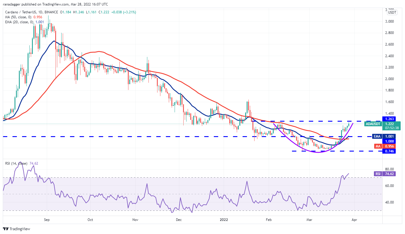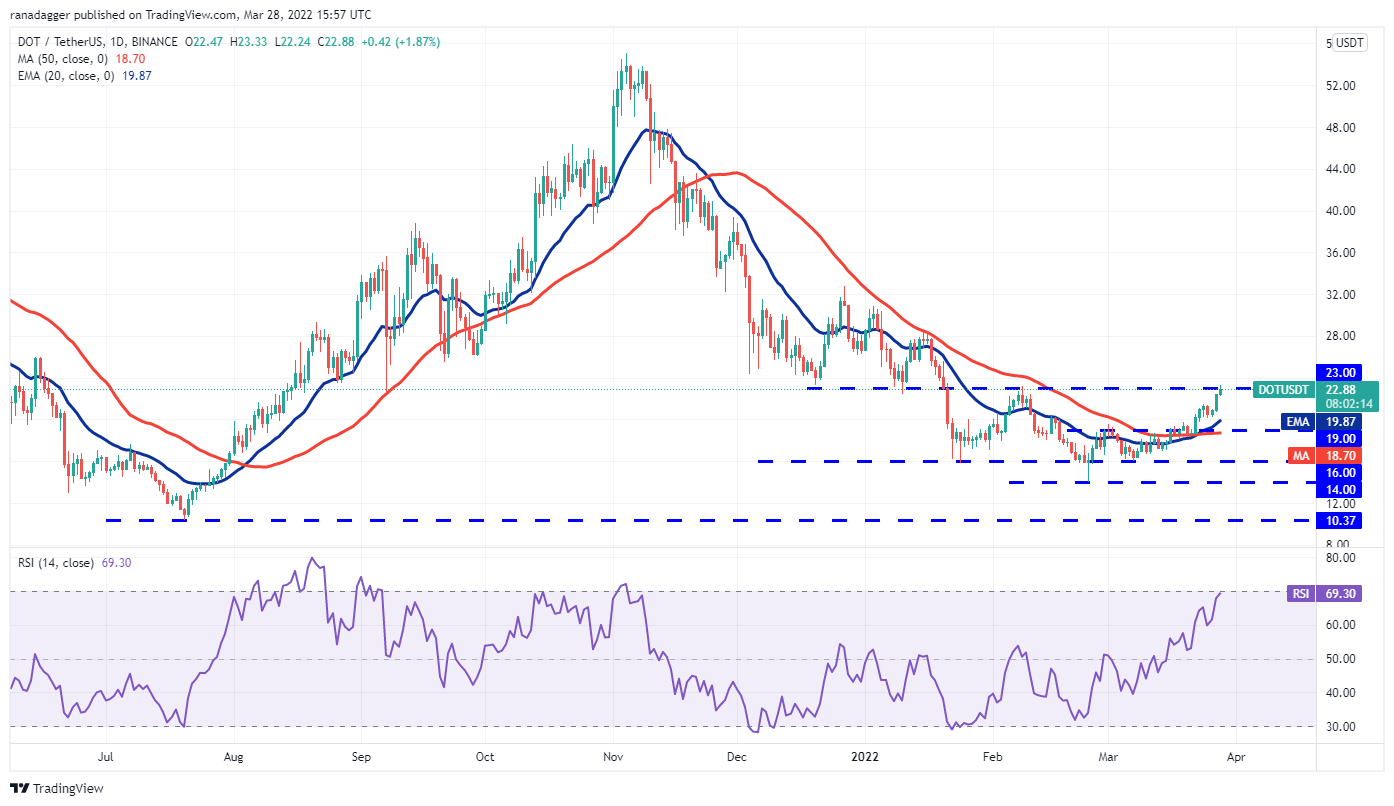 Polkadot (DOT) picked up momentum on March 27 and has reached the stiff overhead resistance at $23. The upsloping 20-day EMA ($20) and the RSI near the overbought zone suggest that bulls have the upper hand.
