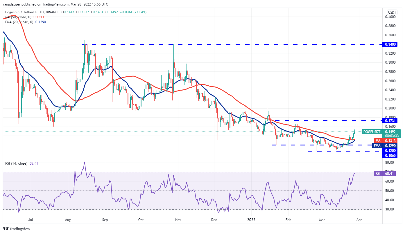 The bulls flipped the 50-day simple moving average (SMA) ($0.13) into support on March 25. This attracted strong buying in Dogecoin (DOGE), putting it on the path to a possible rally to $0.17.