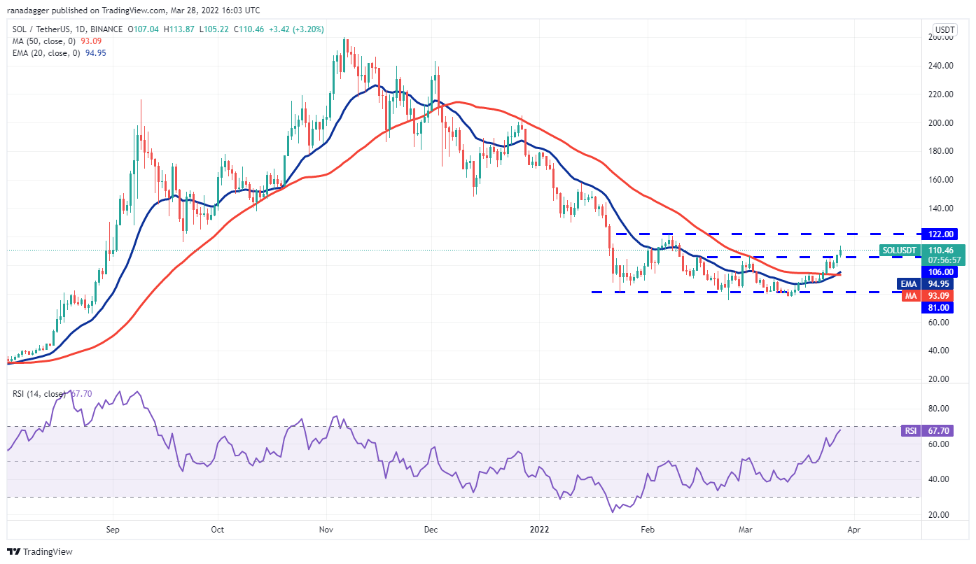 After trading near the overhead resistance at $106 for a few days, Solana (SOL) broke and closed above the level on March 27. The moving averages have completed a bullish crossover and the RSI is near the overbought zone, indicating an advantage to buyers.