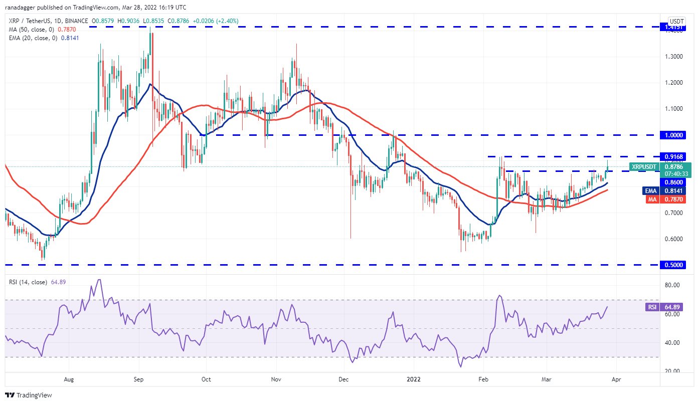 Ripple (XRP) turned up on March 26, indicating that bulls are buying on minor dips. The buyers pushed the price above the strong resistance at $0.86 but are facing resistance near $0.91.