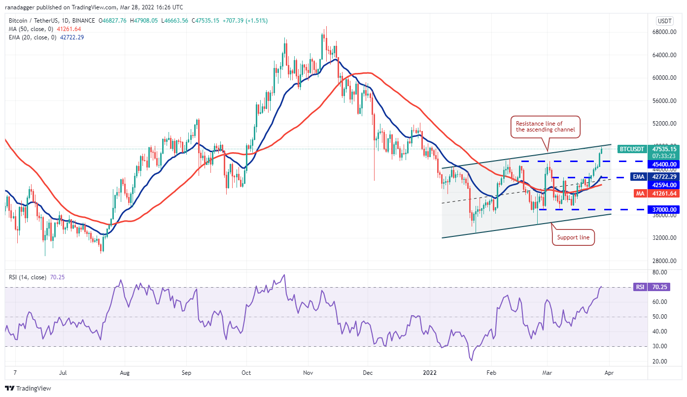 The bears may attempt to stall the up-move at the resistance line of the ascending channel but if bulls overcome this barrier, the BTC/USDT pair could rally to the psychological level at $50,000 and later to $52,000.