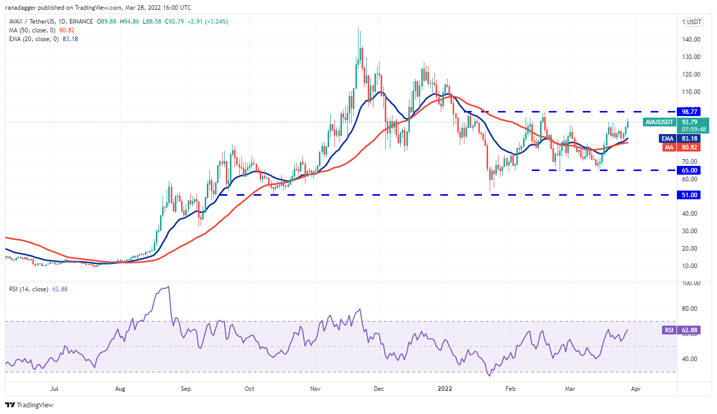 Avalanche (AVAX) rebounded off the 20-day EMA ($83) on March 26, indicating that bulls are buying on dips. The buyers will now try to sustain the price above the immediate resistance at $92.