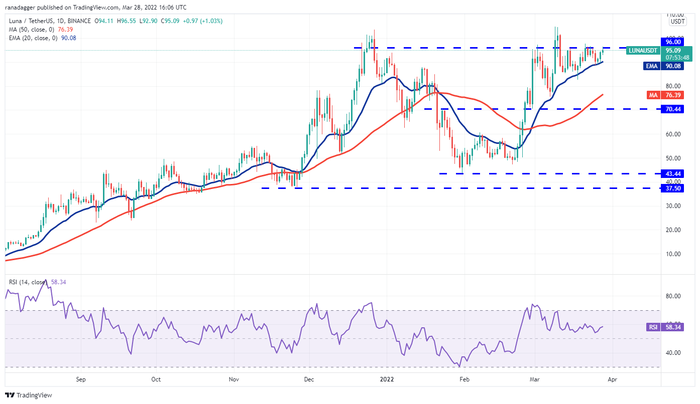 Terra’s LUNA token has been stuck in a tight range between the overhead resistance at $96 and the support at the 20-day EMA ($90). This tight-range trading could soon lead to a sharp trending move.