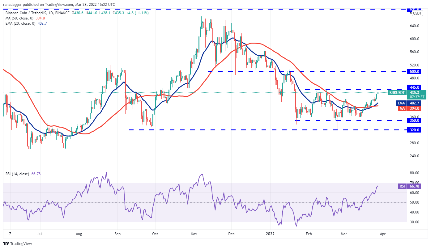 The rising 20-day exponential moving average (EMA) ($402) and the RSI near the overbought zone indicate that bulls are in control. If buyers thrust the price above $445, the BNB/USDT pair could rally toward the psychological level at $500. This level could again act as a strong resistance.
