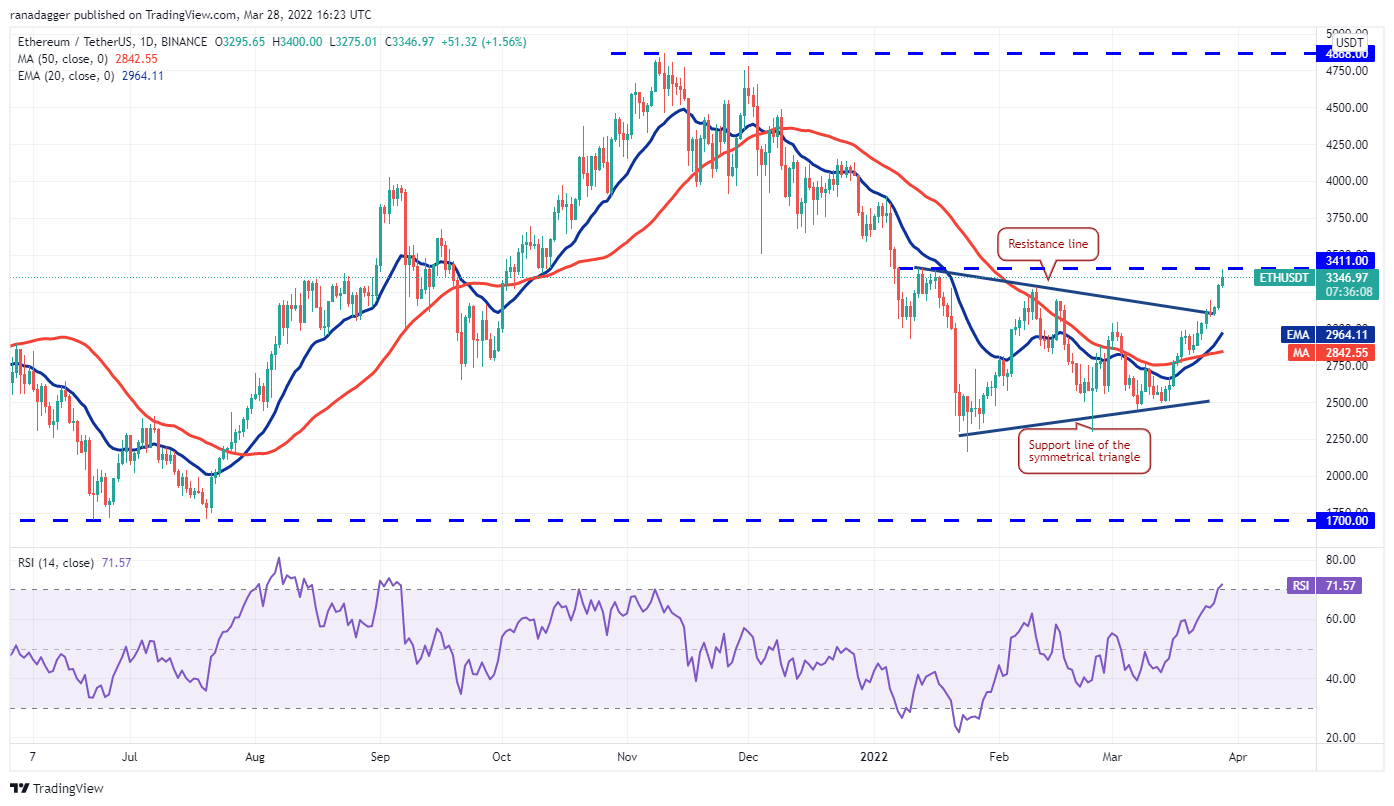 The momentum picked up on March 27 and the ETH/USDT pair has reached $3,411 where the bulls may encounter a minor resistance. If bulls bulldoze their way through, the ETH/USDT pair could rally toward the psychological level at $4,000.