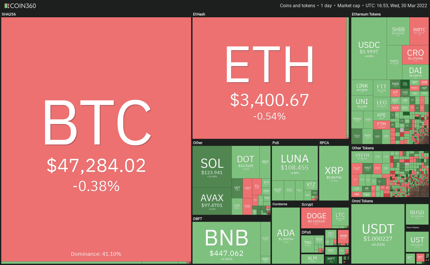 Tento príspevok bol pôvodne publikovaný na stránke https://cointelegraph.com/news/price-analysis-3-30-btc-eth-bnb-xrp-ada-luna-sol-avax-dot-doge a autorom článku je Cointelegraph By Rakesh Upadhyay. Tento článok je iba kópia originálneho článku.