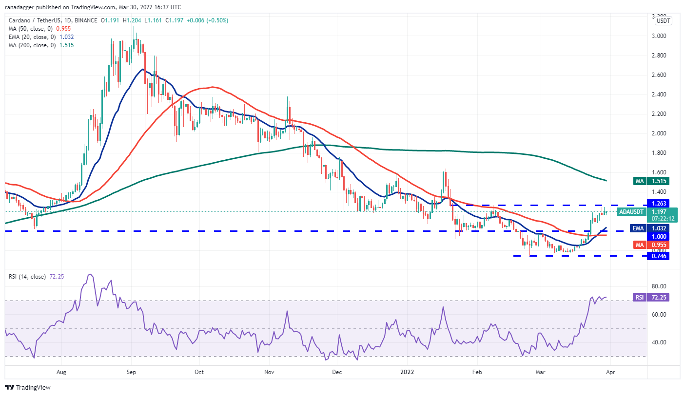 Cardano (ADA) is facing resistance at $1.26 as seen from the long wick on the candlestick on March 28 and 29. A minor positive is that the bulls have not given up much ground.