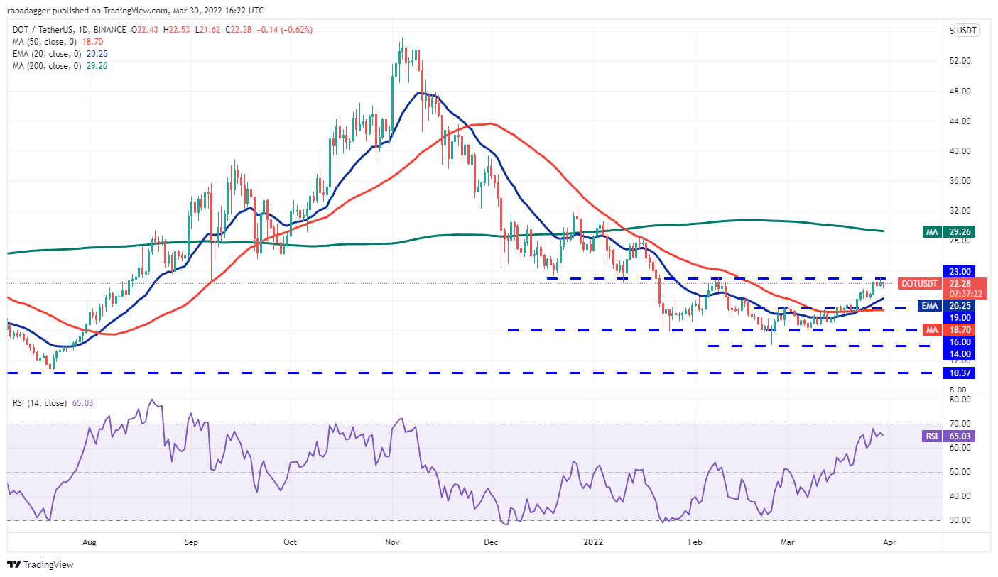 The 20-day EMA ($20) is sloping up and the RSI is in the positive zone, indicating that the path of least resistance is to the upside. If bulls drive and sustain the price above $23, the DOT/USDT pair could pick up momentum and rally to the 200-day SMA ($29).
