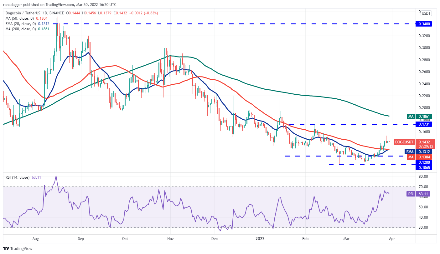 Dogecoin (DOGE) rose above $0.15 on March 28 but the long wick on the day’s candlestick suggests that bears are selling at higher levels.