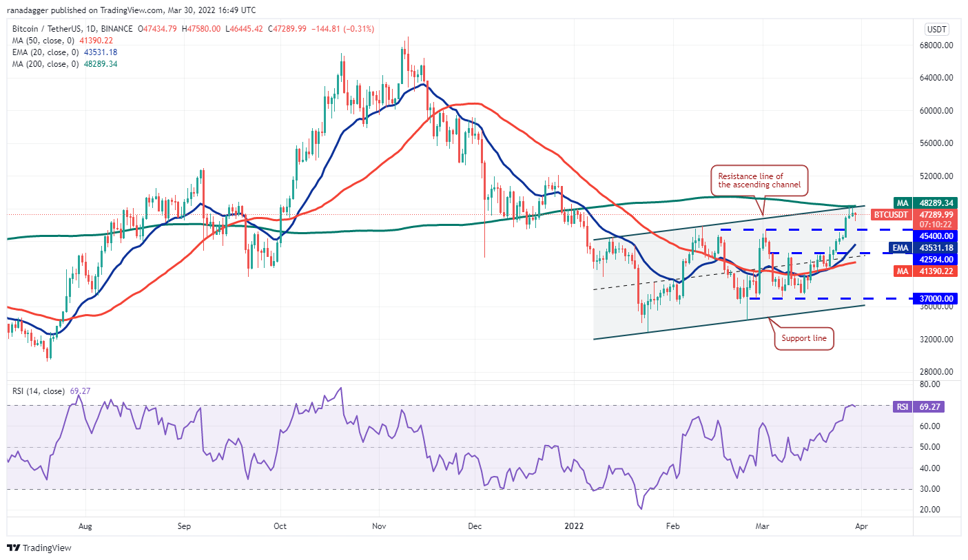 Bitcoin rose to the 200-day SMA ($48,288) on March 28 but the bulls could not push the price above it. The buyers again tried to clear the overhead hurdle on March 29 but failed.