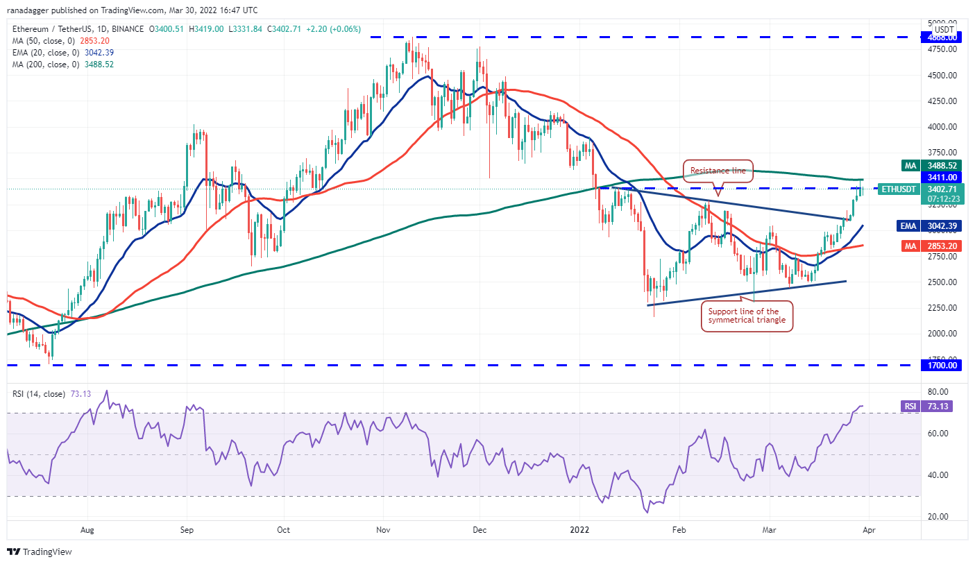 Ether (ETH) broke and closed above the overhead resistance at $3,411 on March 29 but the bulls could not clear the obstacle at the 200-day SMA ($3,488). This indicates that bears have not yet given up and are attempting to stall the recovery at the 200-day SMA.