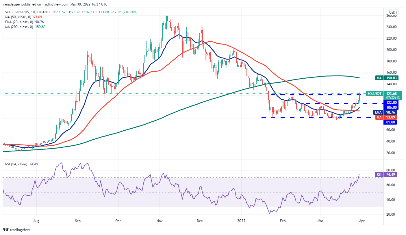 If buyers sustain the price above $122, the SOL/USDT pair could start a new uptrend, which could reach the 200-day SMA ($150). This level is likely to act as a stiff resistance but if bulls overcome it, the rally could reach $180.