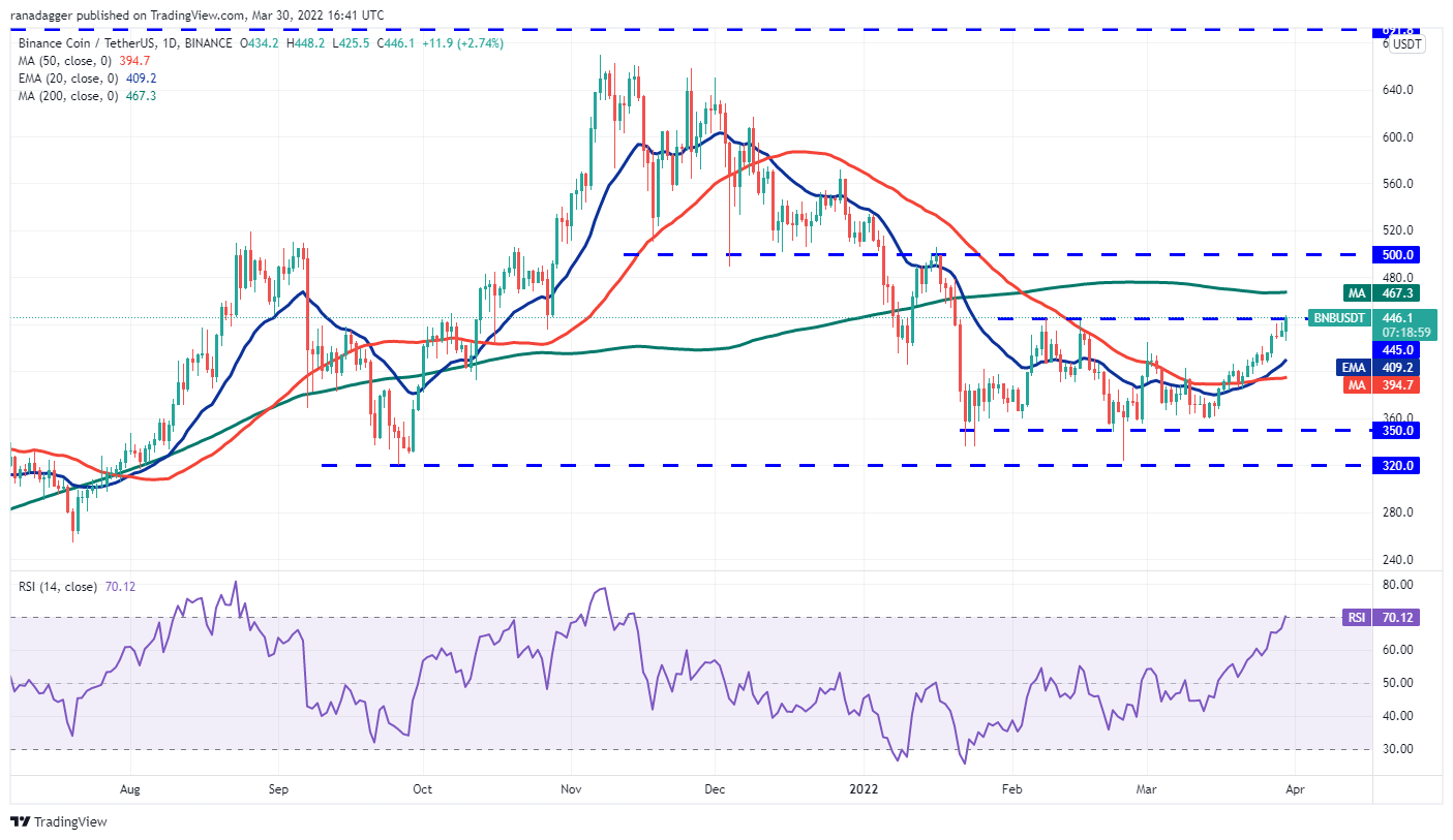 The upsloping 20-day EMA ($409) and the RSI in the overbought territory indicate that bulls are in control. If they sustain the price above $445, the BNB/USDT pair could rise to the 200-day SMA ($467) and later to $500.