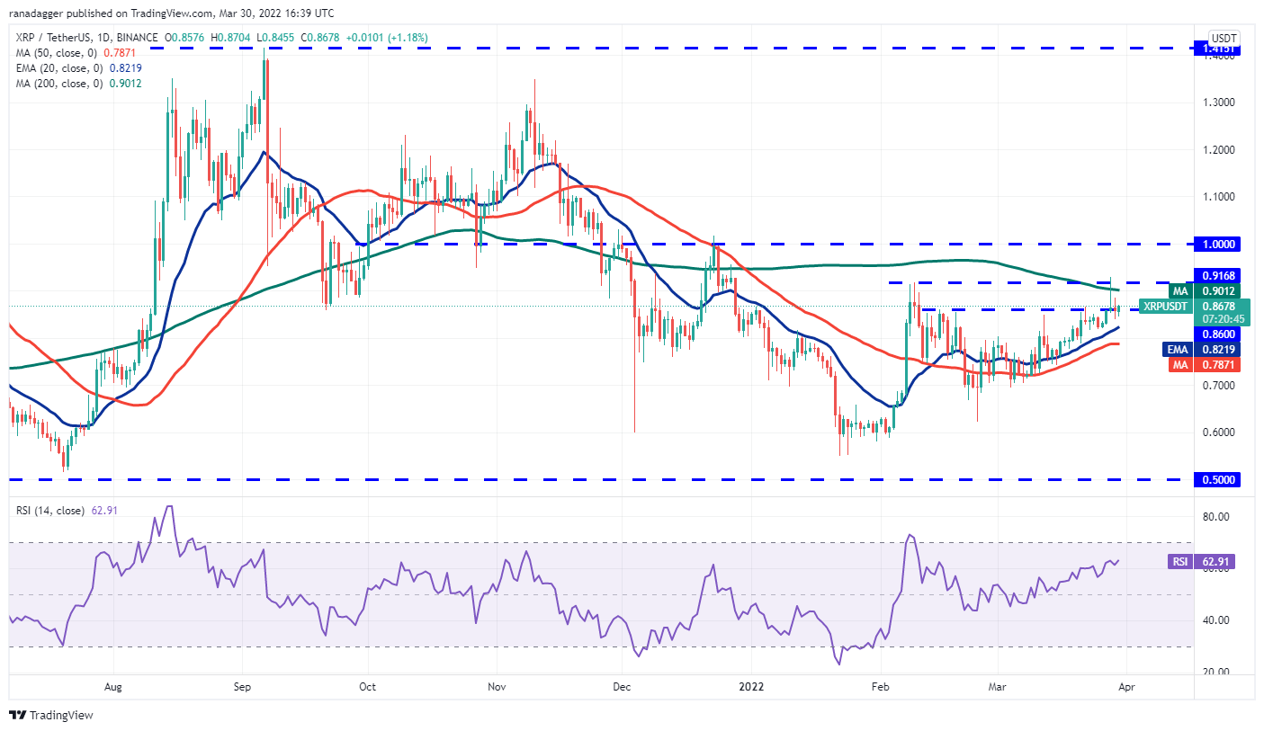 Ripple (XRP) broke above the overhead resistance at $0.91 on March 28 but the bears did not allow the price to sustain the higher levels. This indicates that the bears are aggressively defending the zone between $0.91 and $1.